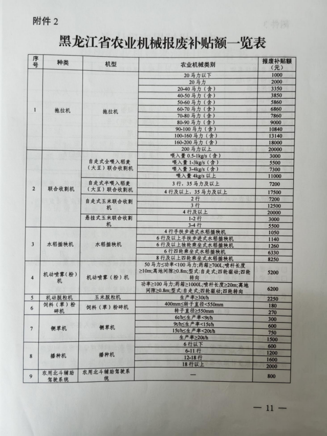 老旧农业机械报废补贴实行定额补贴,按照《黑龙江省农业机械报废补贴额一览表》(见附件2)执行,其中农用北斗辅助驾驶系统报废补贴申领要以购置新设备为前提。更新部分补贴标准按农机购置与应用补贴政策相关规定执行。