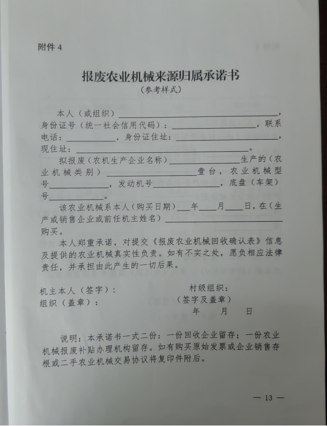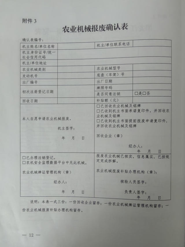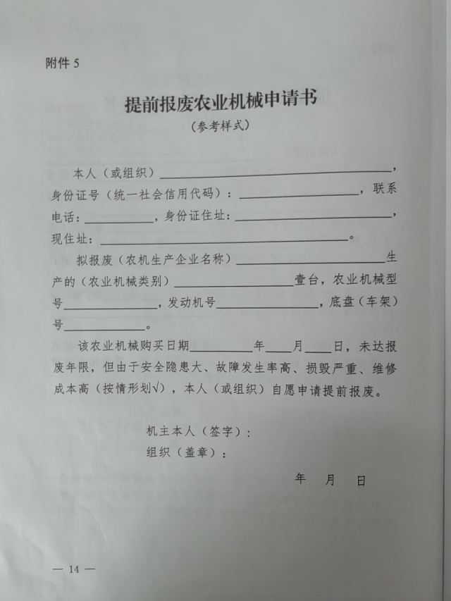 3.对未达报废年限但安全隐患大、故障发生率高、损毁严重、维修成本高的农业机械,经机主书面申请可提前办理报废(见附件5),并申请报废补贴。