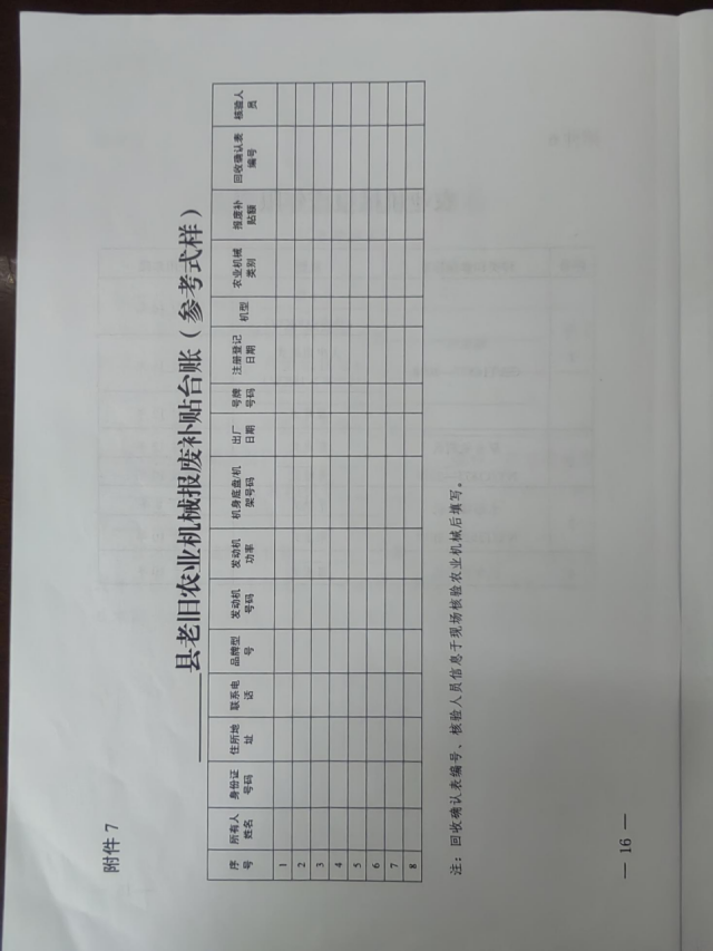 机主将身份证件复印件,人机合影照片,申报资料,包括《农业机械报废确认表》(附件3,以下简称《确认表》)、《报废农业机械来源归属承诺书》(附件4)等,报送到当地农机主管部门申请报废(可由村级代办),农机服务站登记机主及拟报废的农业机械信息,建立台账(见附件7)。