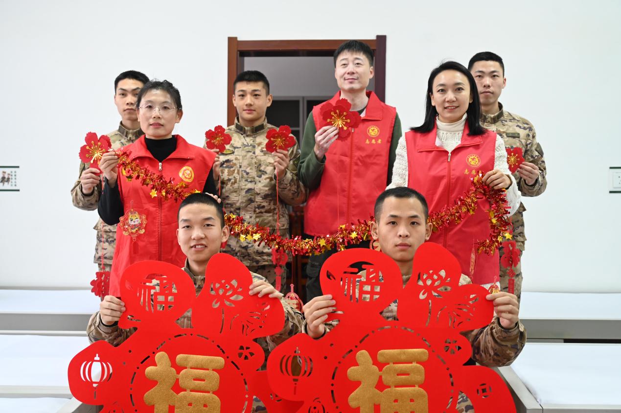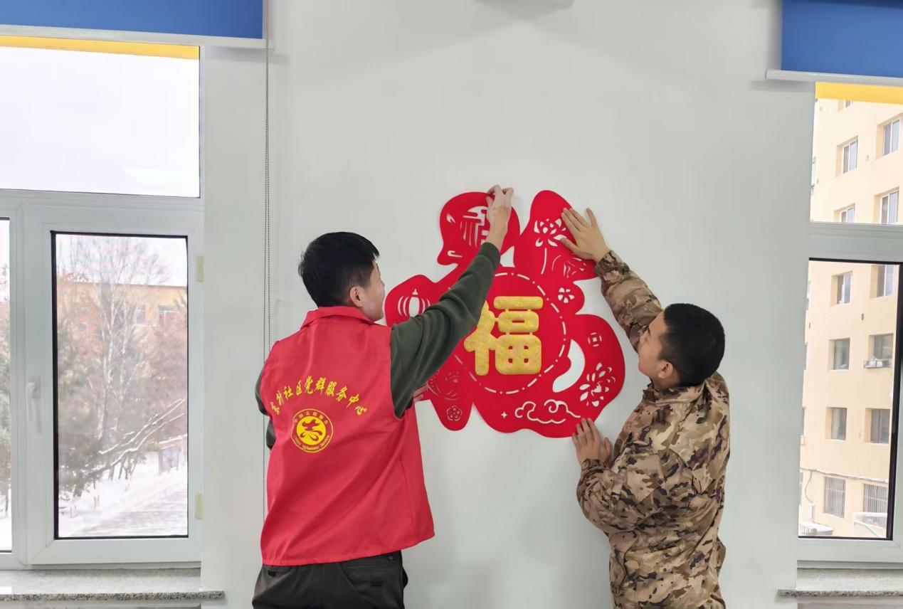 在营区内,东升镇东升社区党群服务中心为官兵们送上了福字、拉花等氛围装饰品,表达了对官兵们温暖的新年祝福。工作人员和官兵们一起贴福字、挂装饰、拉彩带……大家共同精心布置,营造出浓浓的“年味”,增添了新春的喜庆,让官兵们在军营感受到家的温暖。