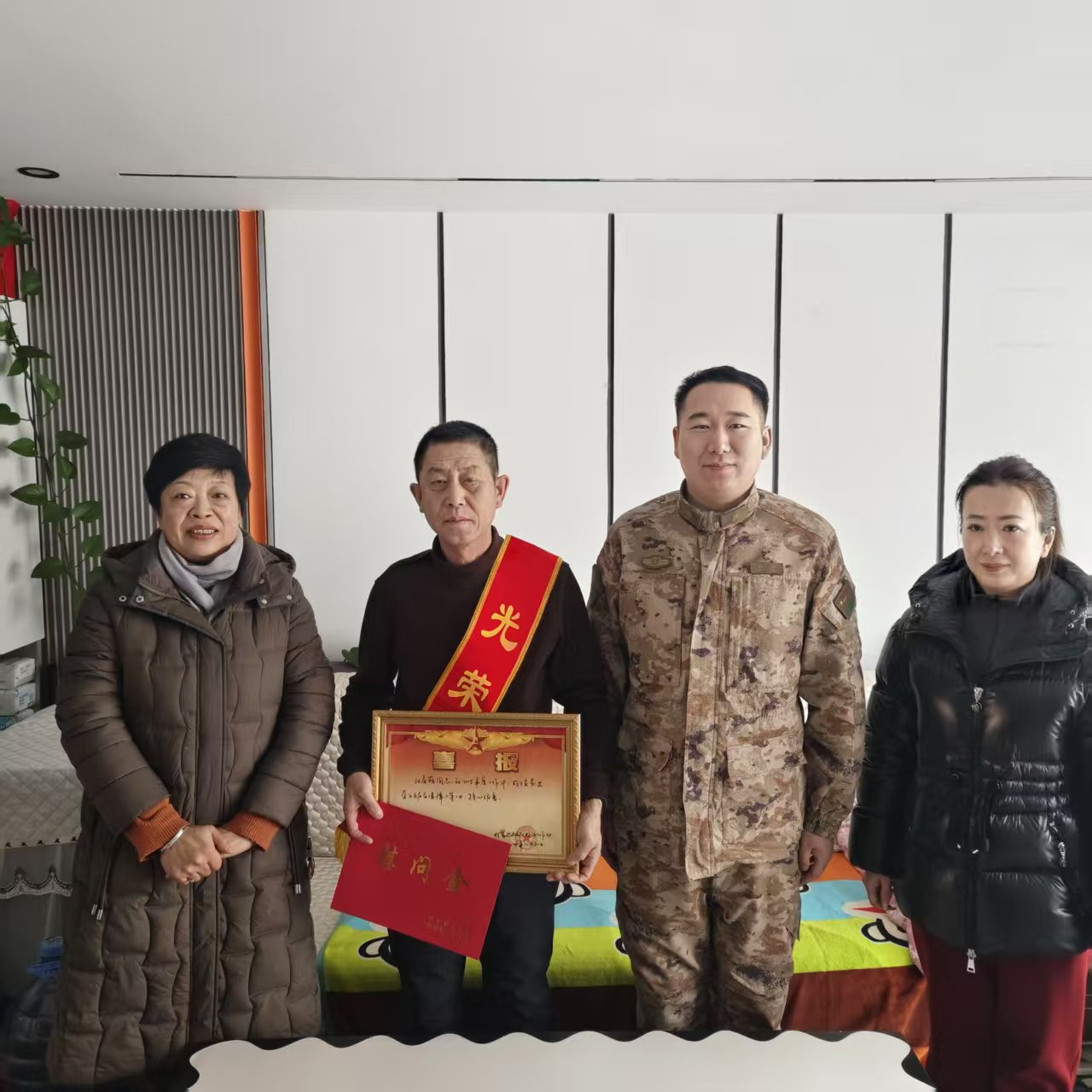 慰问组来到荣立三等功、三级荣誉表彰的现役军人家中,每到一处,工作人员都为军属披上绶带,将承载着荣誉的喜报、慰问金和慰问信送到军属手中,他们脸上洋溢着自豪与喜悦。慰问组来到“四有”优秀军官、士兵和文职人员的家庭,将“四有”喜报与新春祝福送到军属手中,把部队表彰与组织关怀送到家门口。